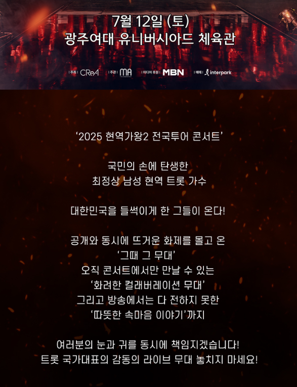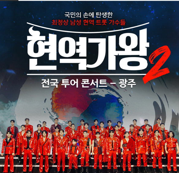 이건 단순한 공연이 아닙니다. 진짜 가왕들이 펼치는 리얼 라이브 무대, ‘현역가왕2 전국투어 콘서트’가 오는 7월, 광주를 뜨겁게 달굽니다. 티켓 매진은 순식간, 지금 예매하지 않으면 후회할지도 몰라요!