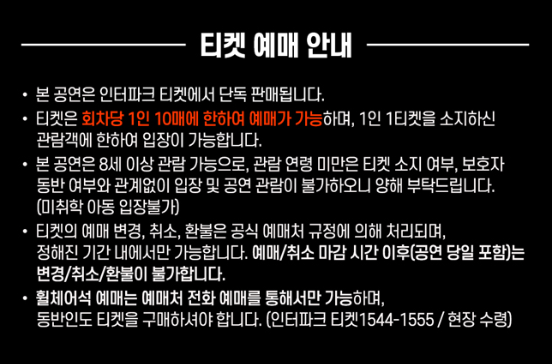 휠체어석은 전화예매(인터파크 1544-1555)만 가능하며, 동반인도 함께 예매해야 합니다.